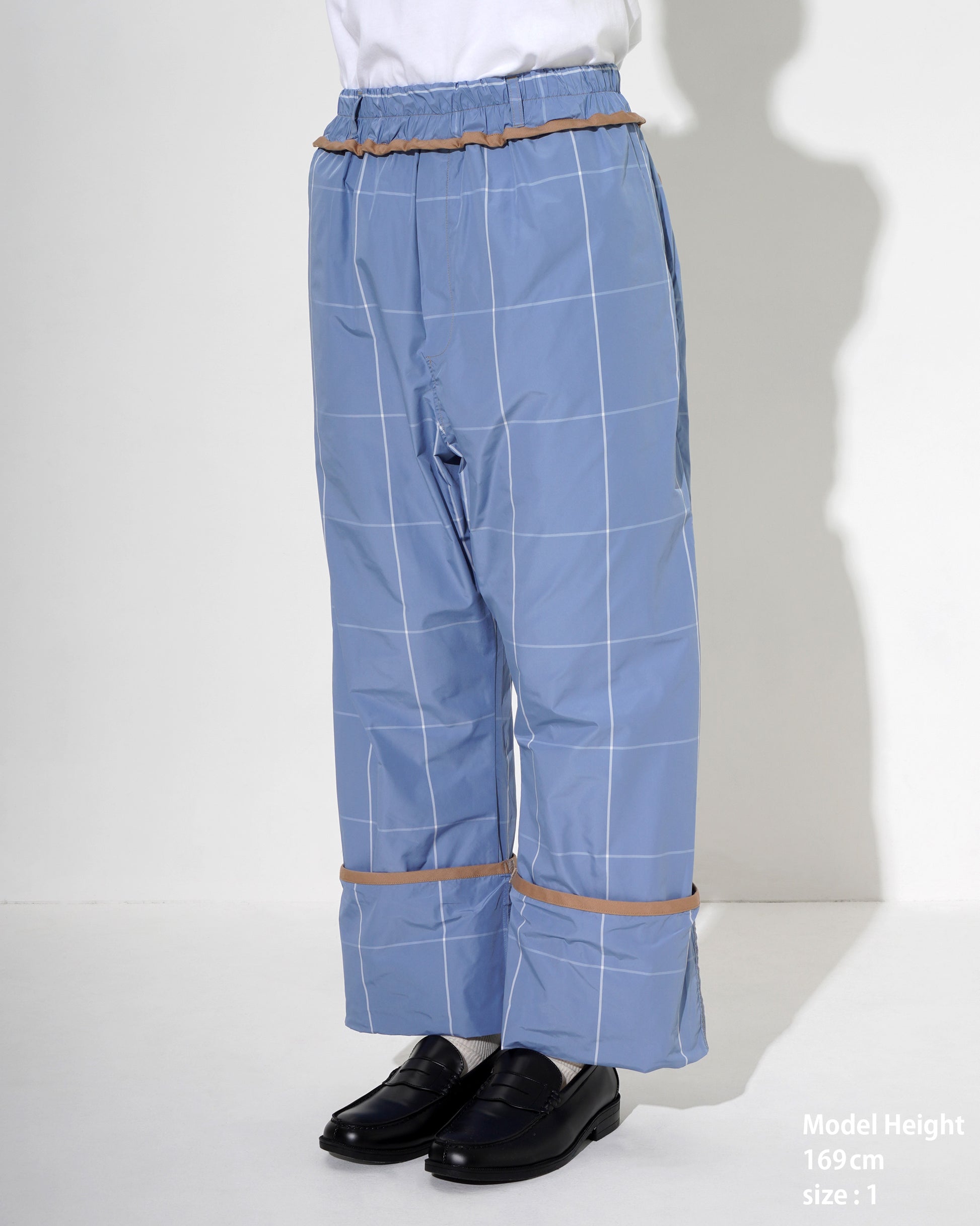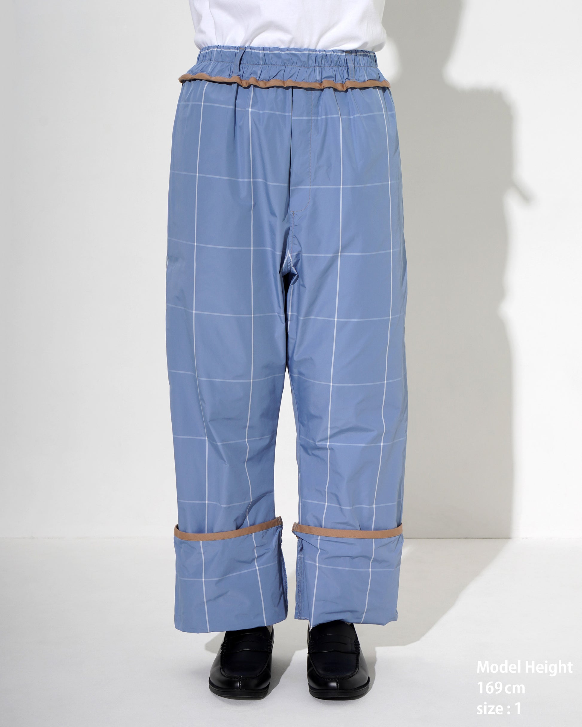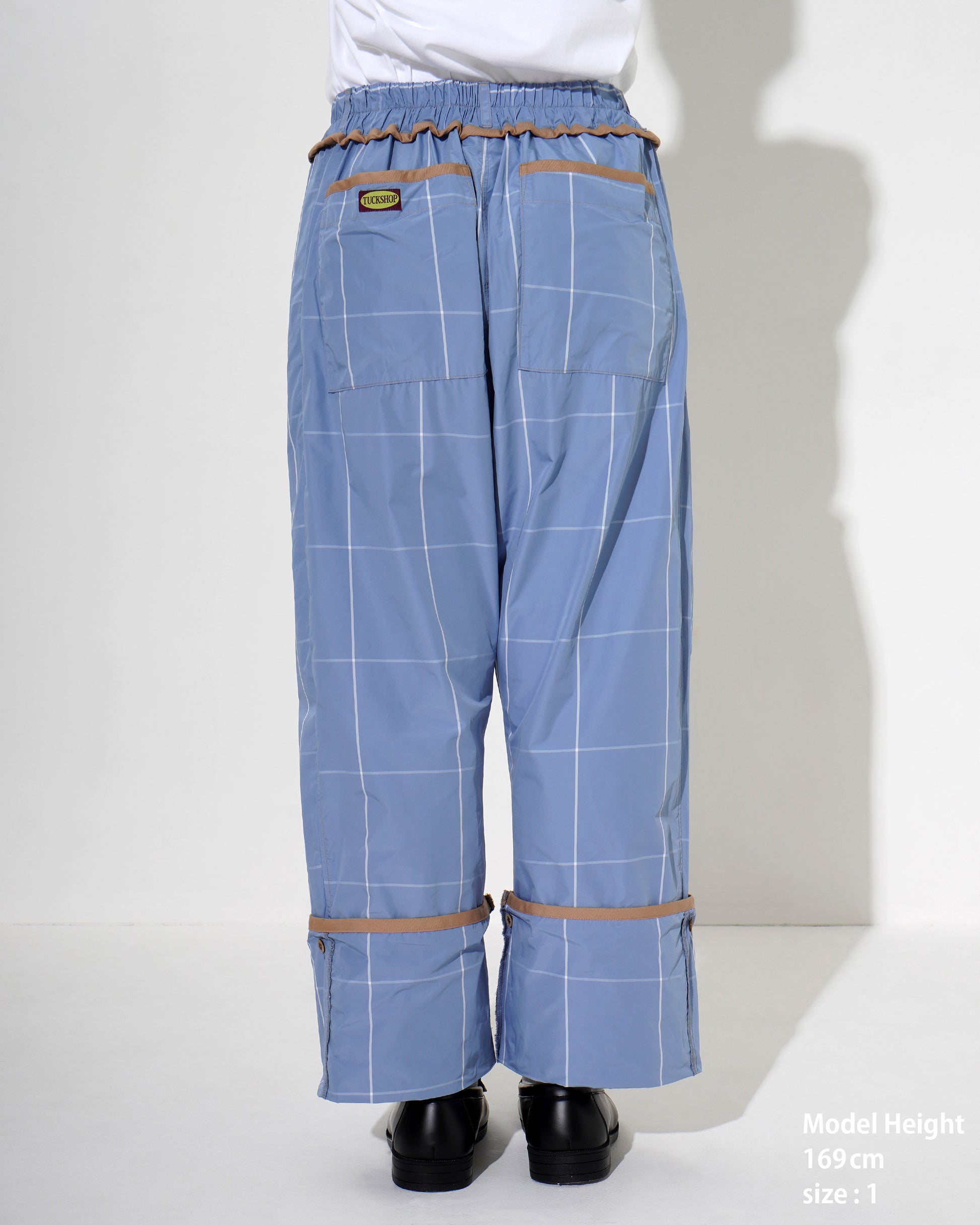 Polyester Check Easy Pants - Elasticized waist - Two adjustable lengths with buttons at hem - Corrugated piping at waist - Two pockets at side seams and back - Pineapple hem and pocket detailing - Logo patch at rear pocket - Belt loops - Front opening is Belt loops - No front opening