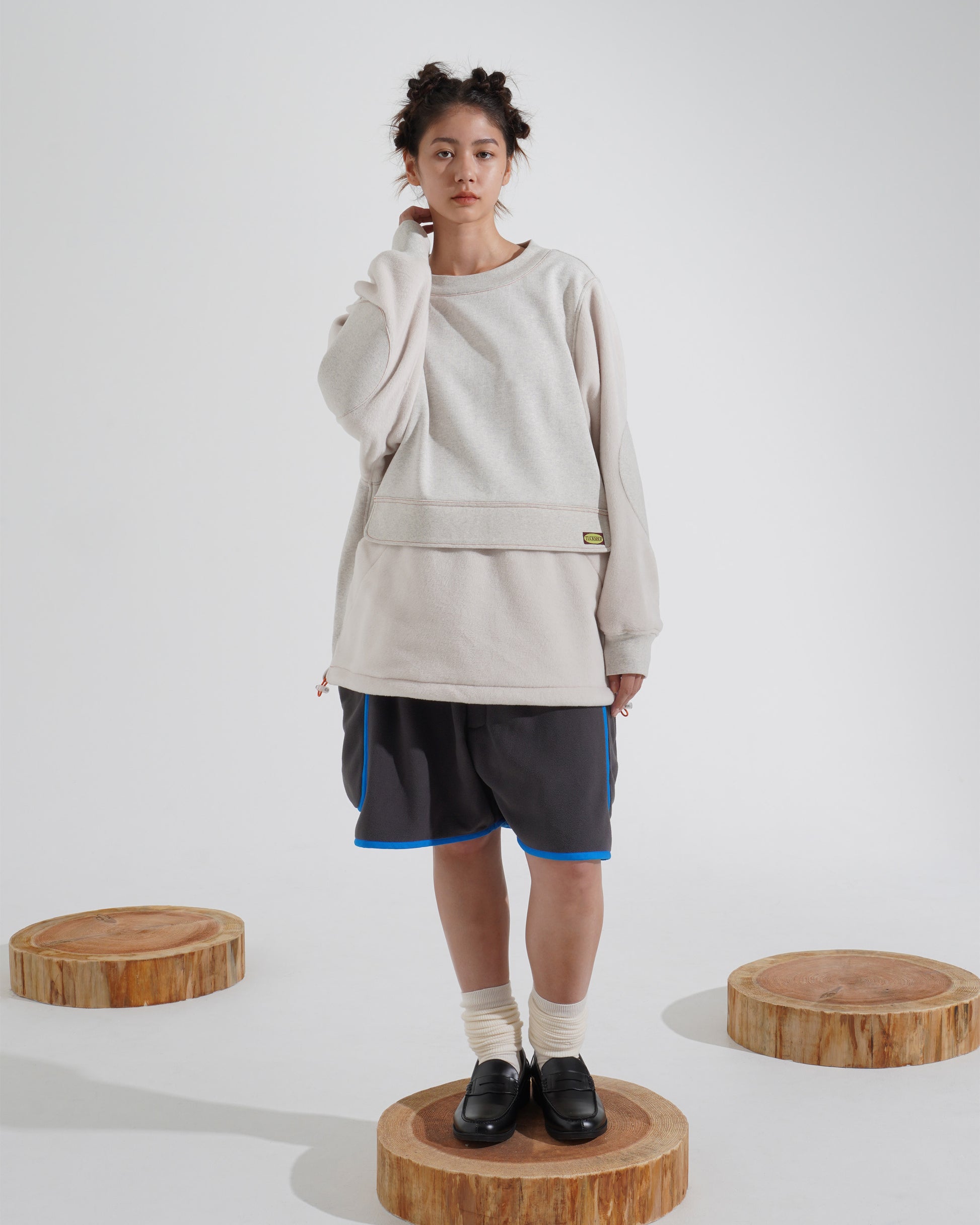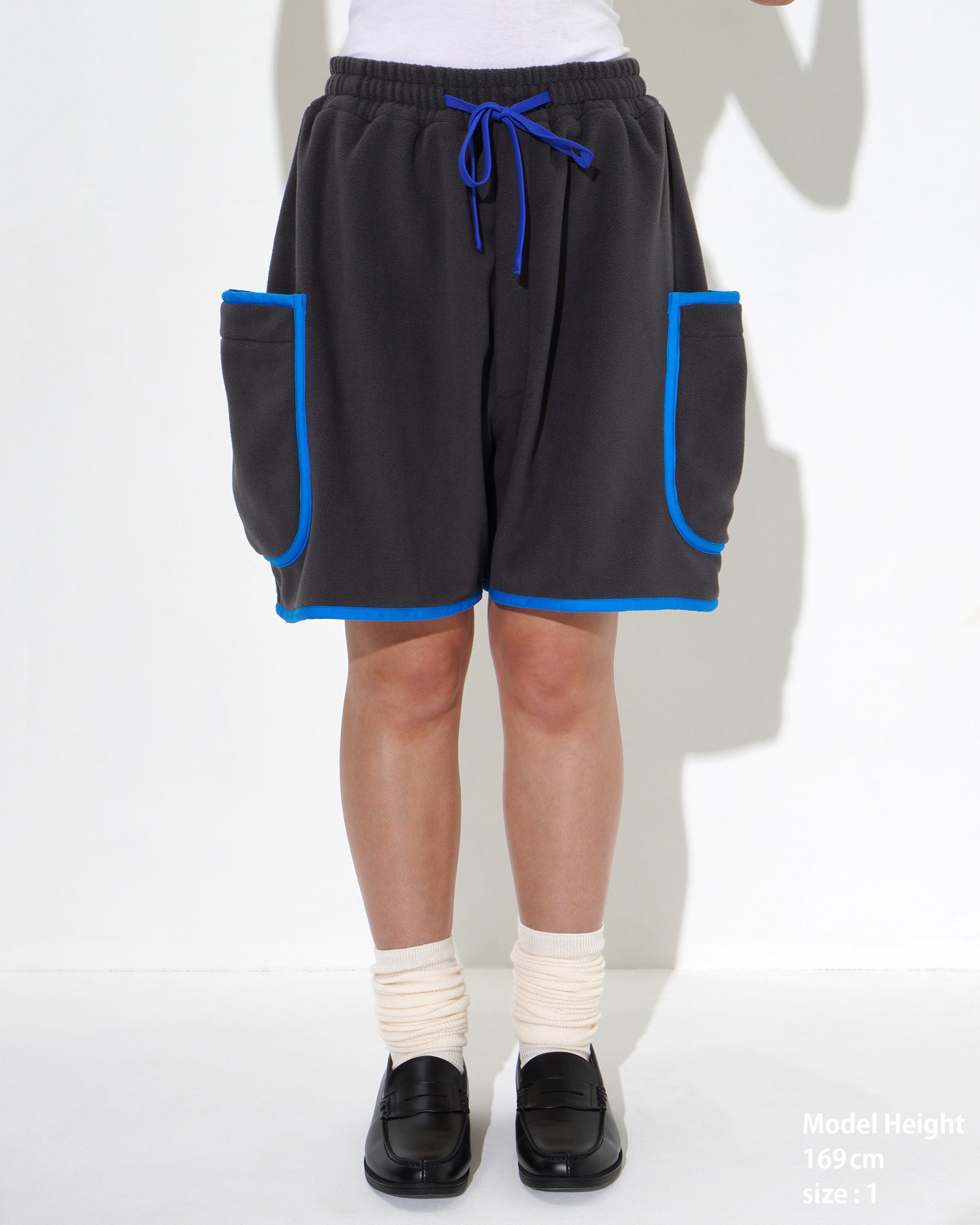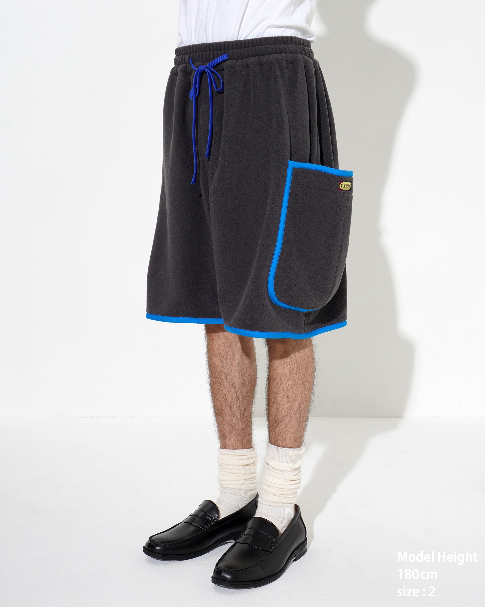 - Color: Gray - Elastic waistband with drawstring - Two deep big pockets on each side - Piping detail along hems and pockets - Curvy outseam - Logo patch on left pocket - No front opening