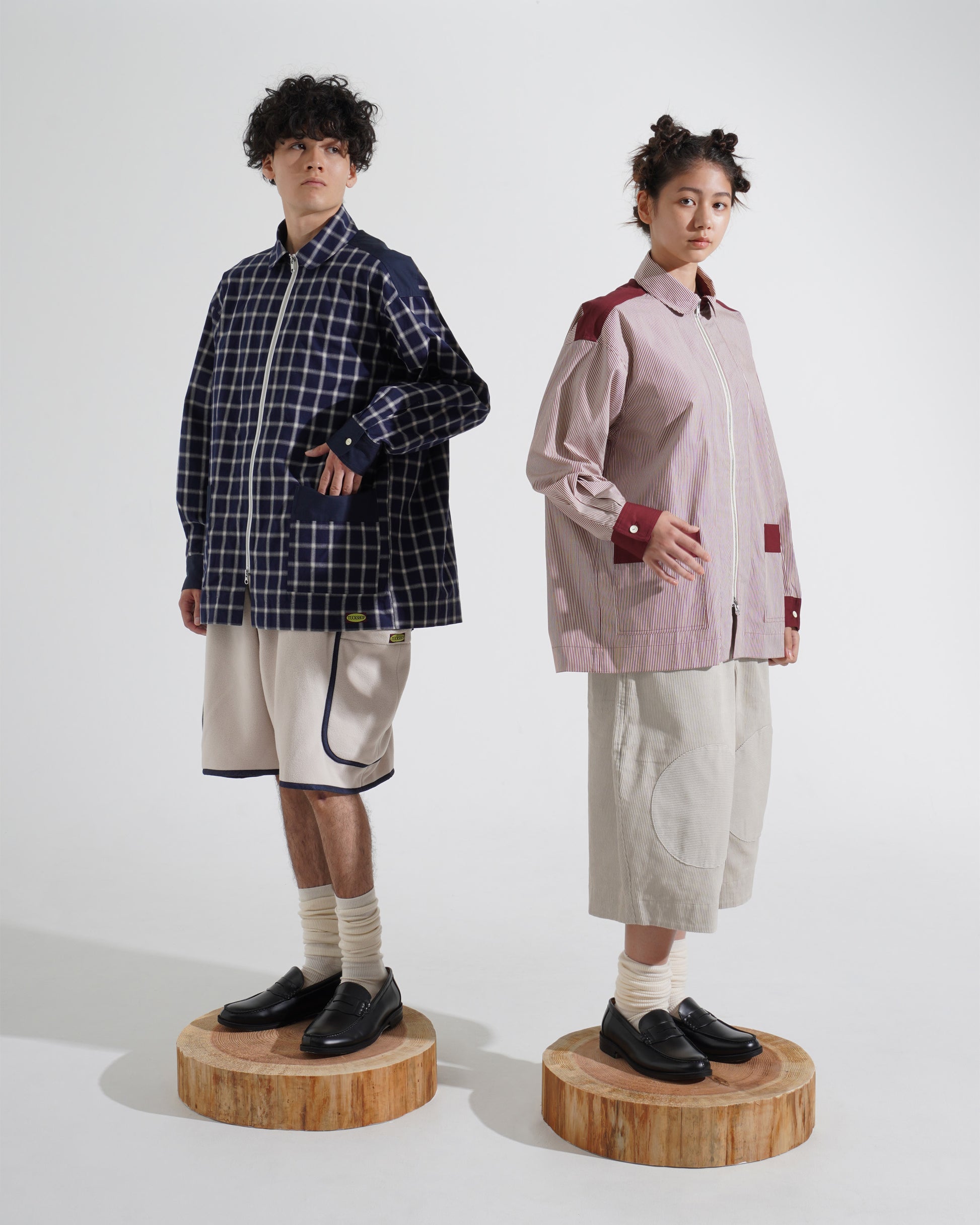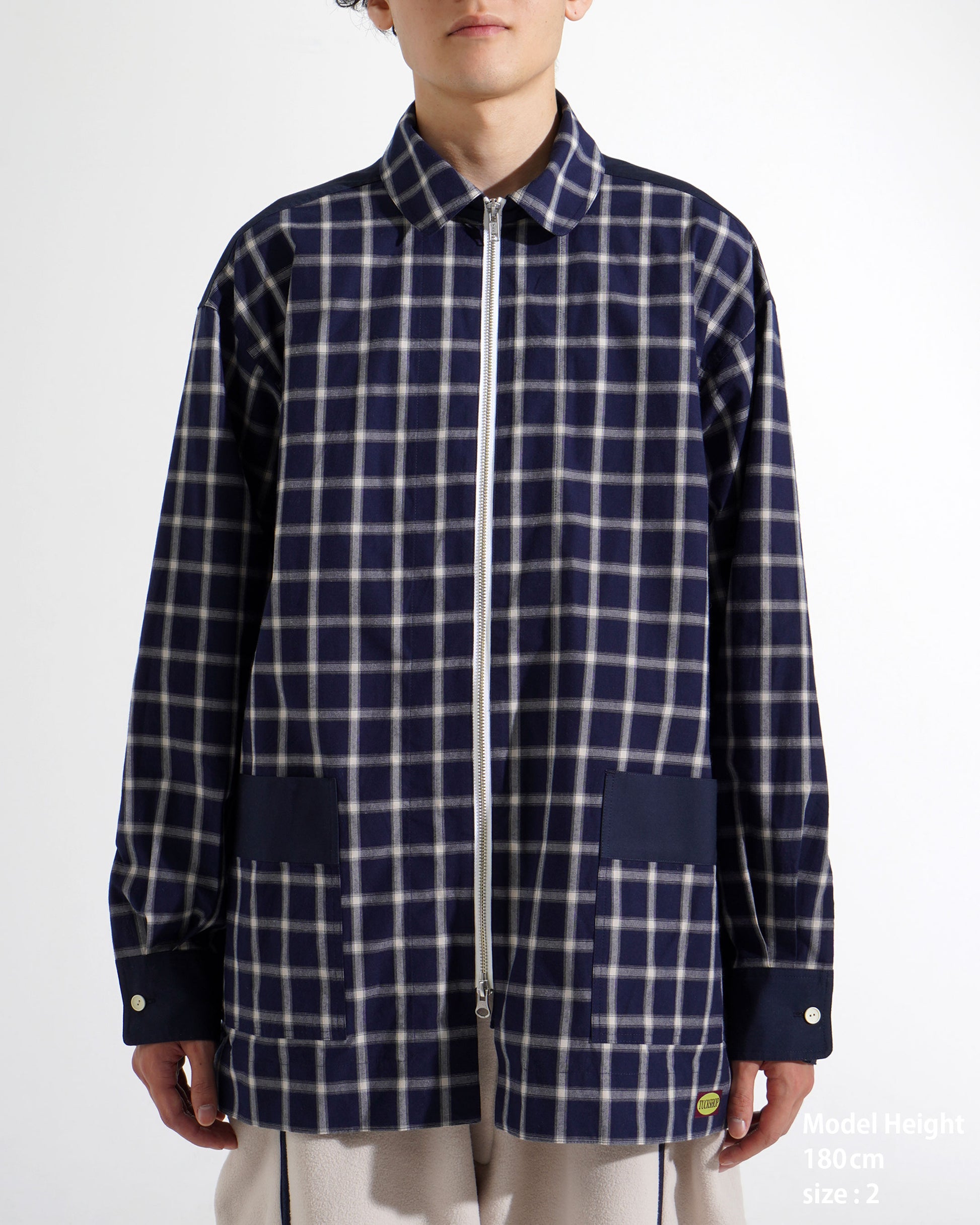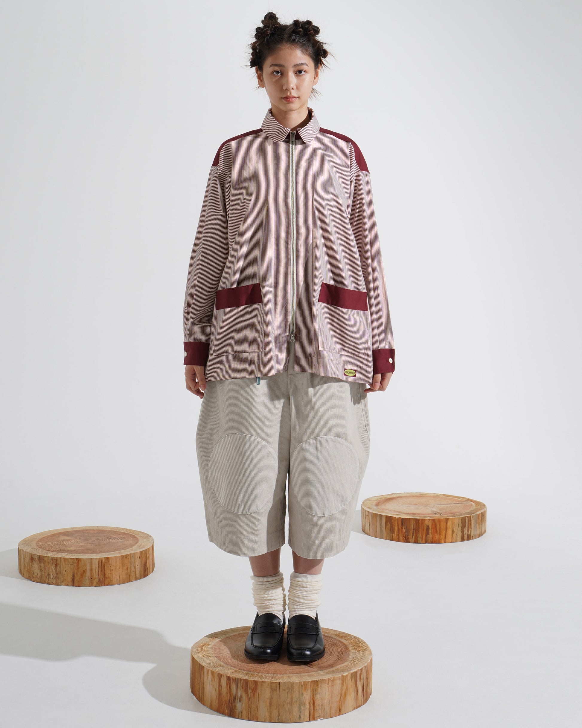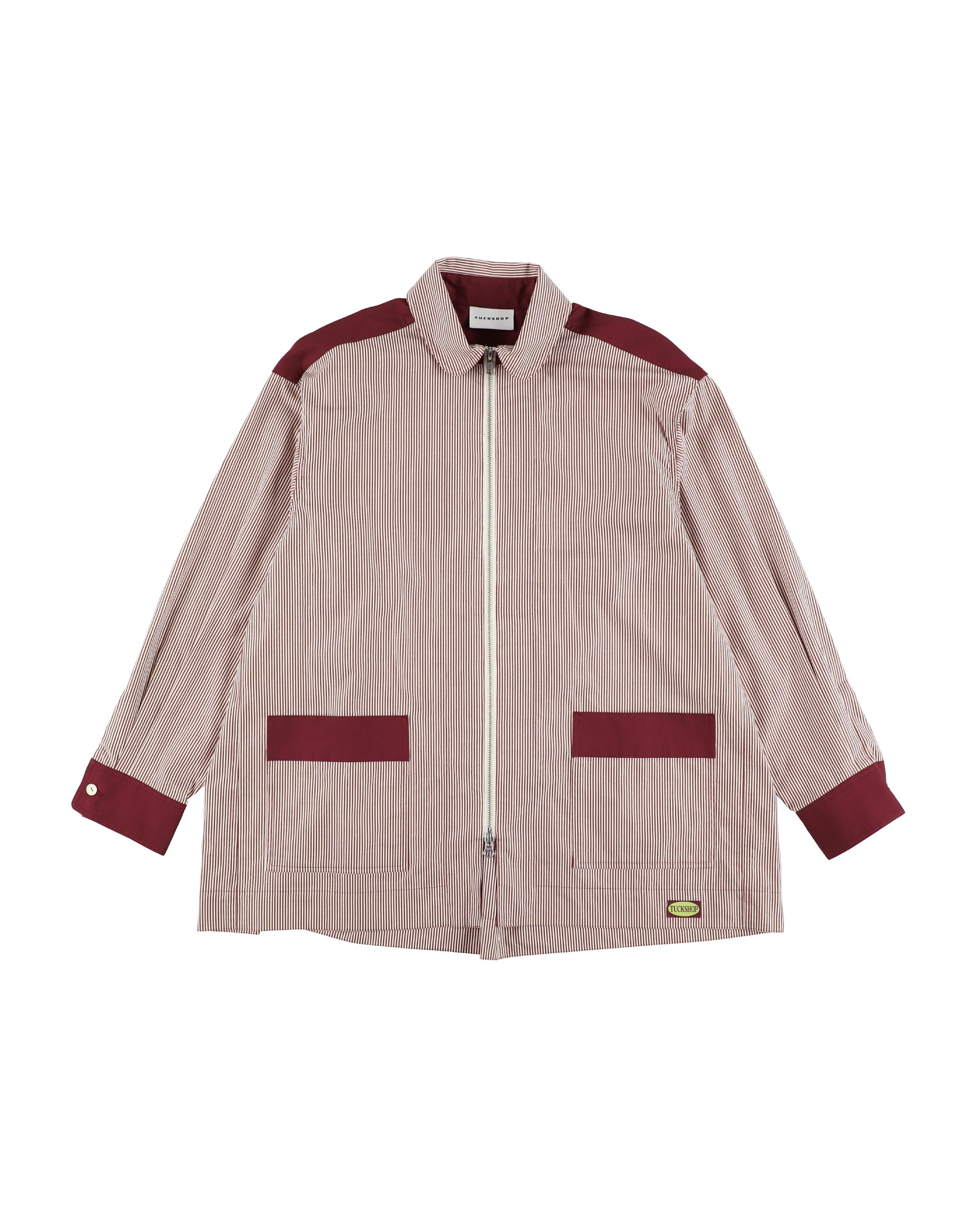 Cotton flannel paneled stripe shirt. - Color: Red - Striped pattern - Spread collar - Front double zipper - Patch pockets - Shirt-tail hem - Dropped shoulders - Buttoned barrel cuffs - Box pleat at back yoke - Logo tag at hem