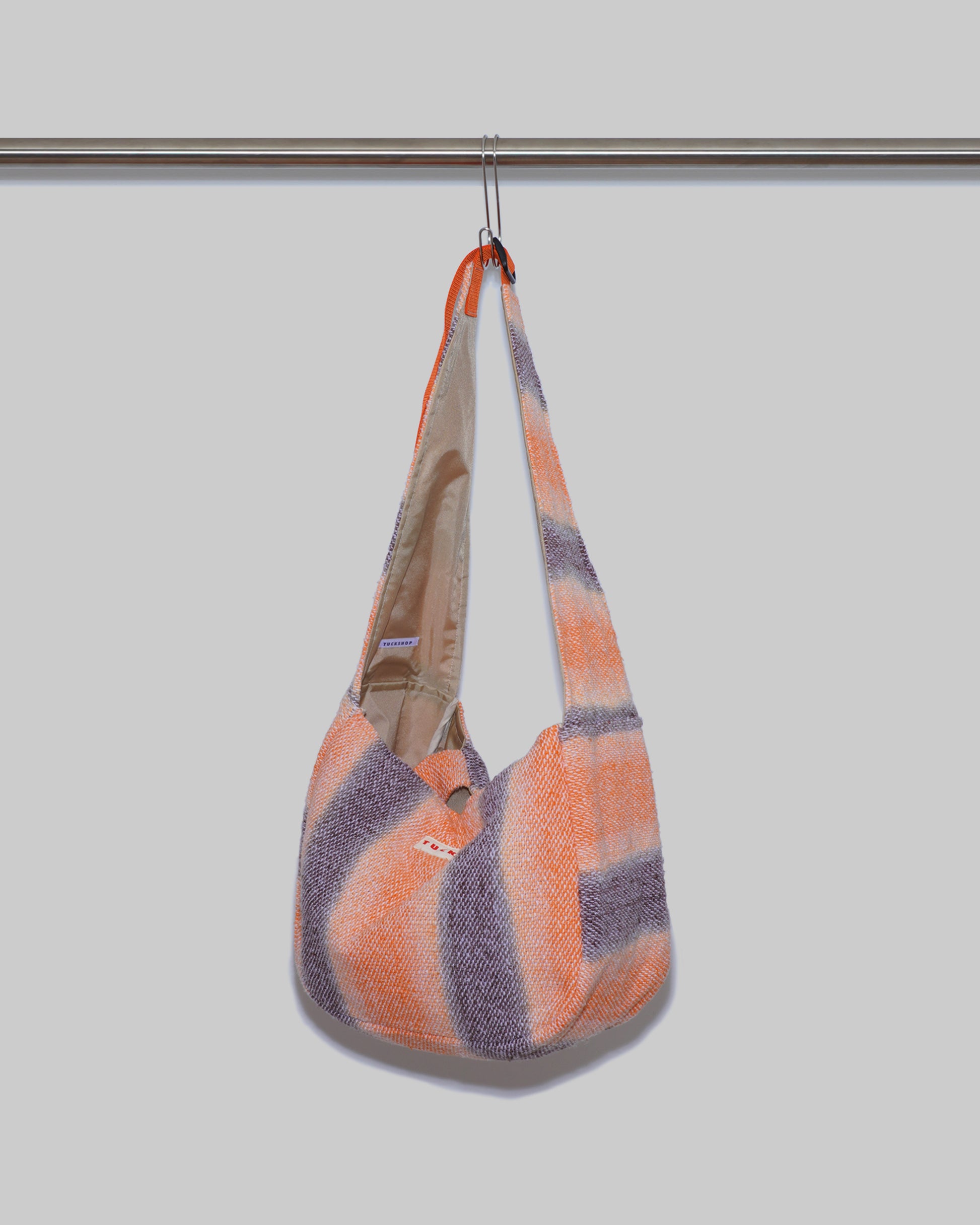 A shoulder tote bag made from hand-dyed striped cotton fabric. It has a two-layer structure with a coarsely woven cotton outer layer and a water-repellent nylon lining. It can be used in two ways, as a crossbody bag or as a handbag, and is recommended for both daily use and travel. Two interior pockets and a printed logo tag on the front. The shoulder straps for crossbody wear can be adjusted in length. Has patch buttons.