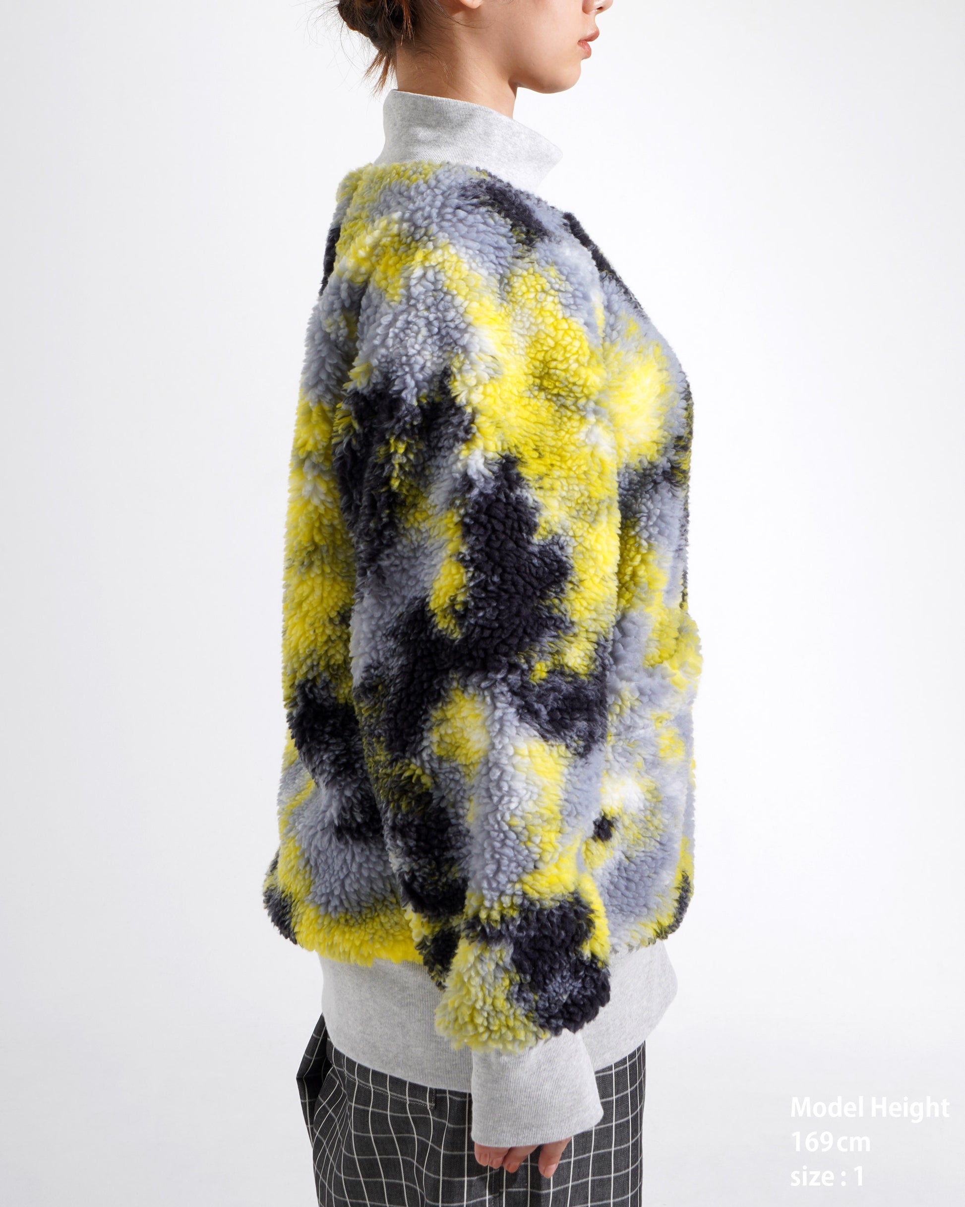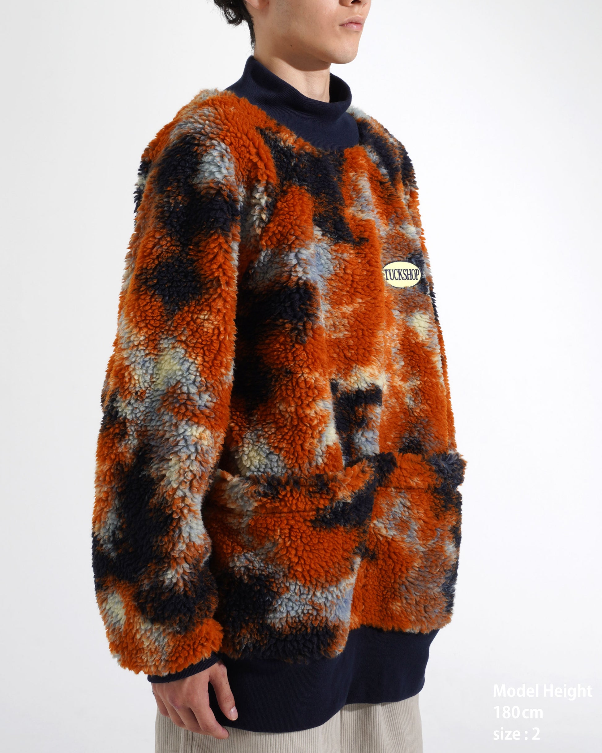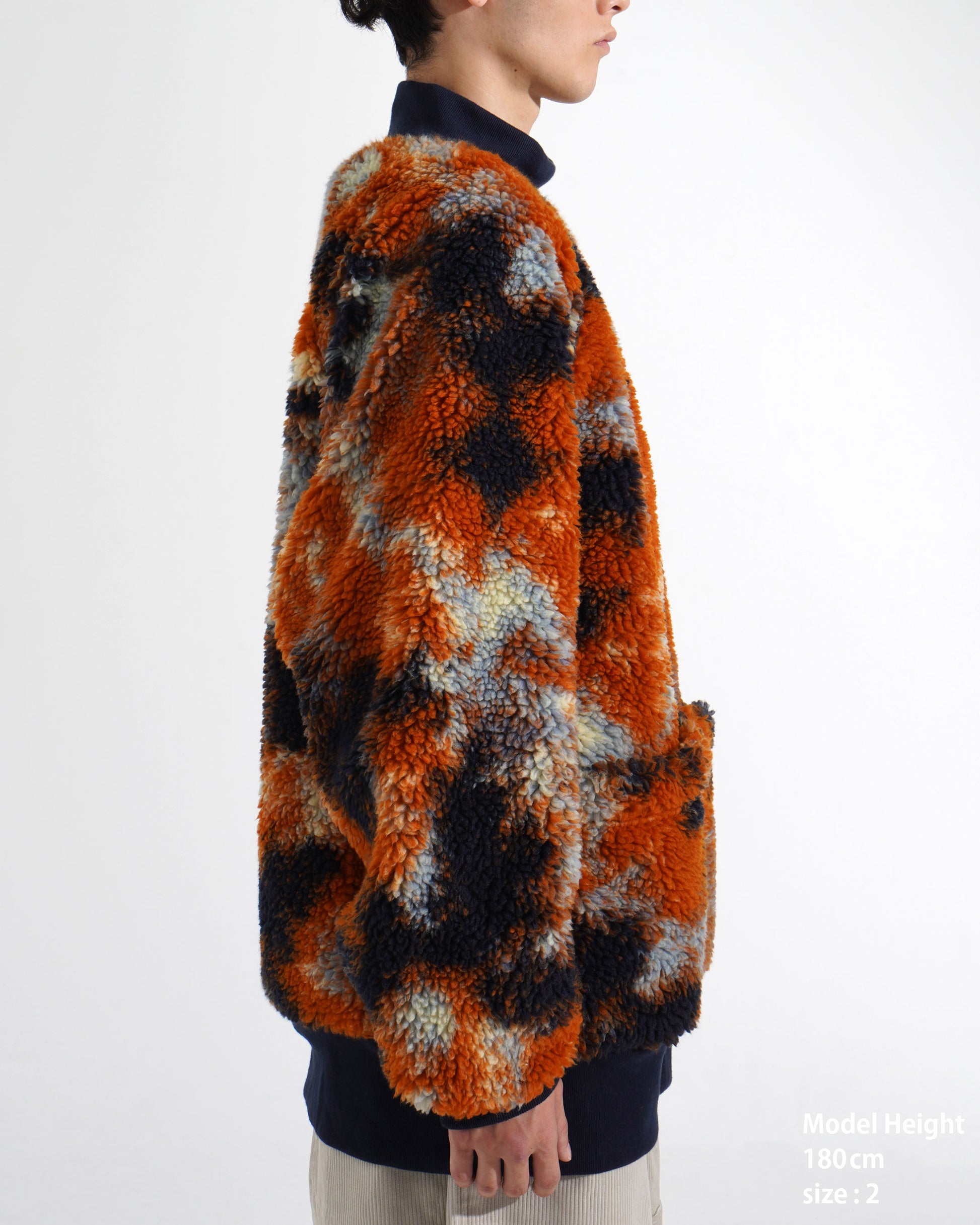 [Caution] ・We recommend professional cleaning, preferably dry cleaning. ・Do not apply the iron directly to the boa fabric. It may melt or deform. Steam ironing is possible from a distance of at least 5 cm. ・The patch is also sensitive to heat; do not press it directly with an iron. ・Boa fabric tends to shed fibers and attract dust. Please handle it gently. ・To prevent lint transfer, wash separately. Turning the garment inside out can help reduce shedding. ・Due to the nature of the material, pilling or fuzzing may occur when the fabric becomes damp from sweat or rain, or through friction. ・The material may shrink slightly after washing. Avoid long washing cycles and handle gently. ・This is a delicate fabric. Please avoid friction or snagging against belts, bags, or rough surfaces. ・Fleece sections are particularly prone to pilling caused by friction.