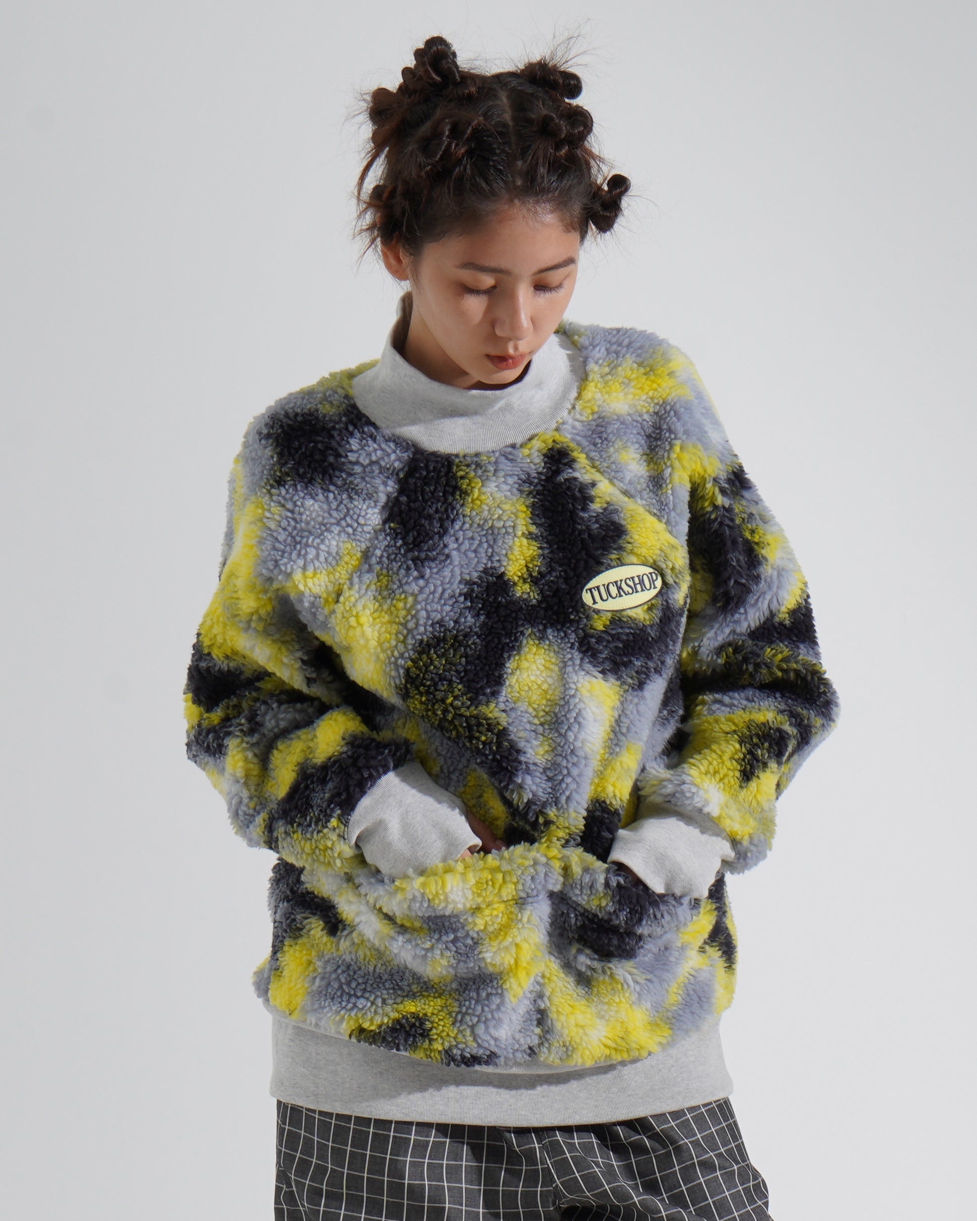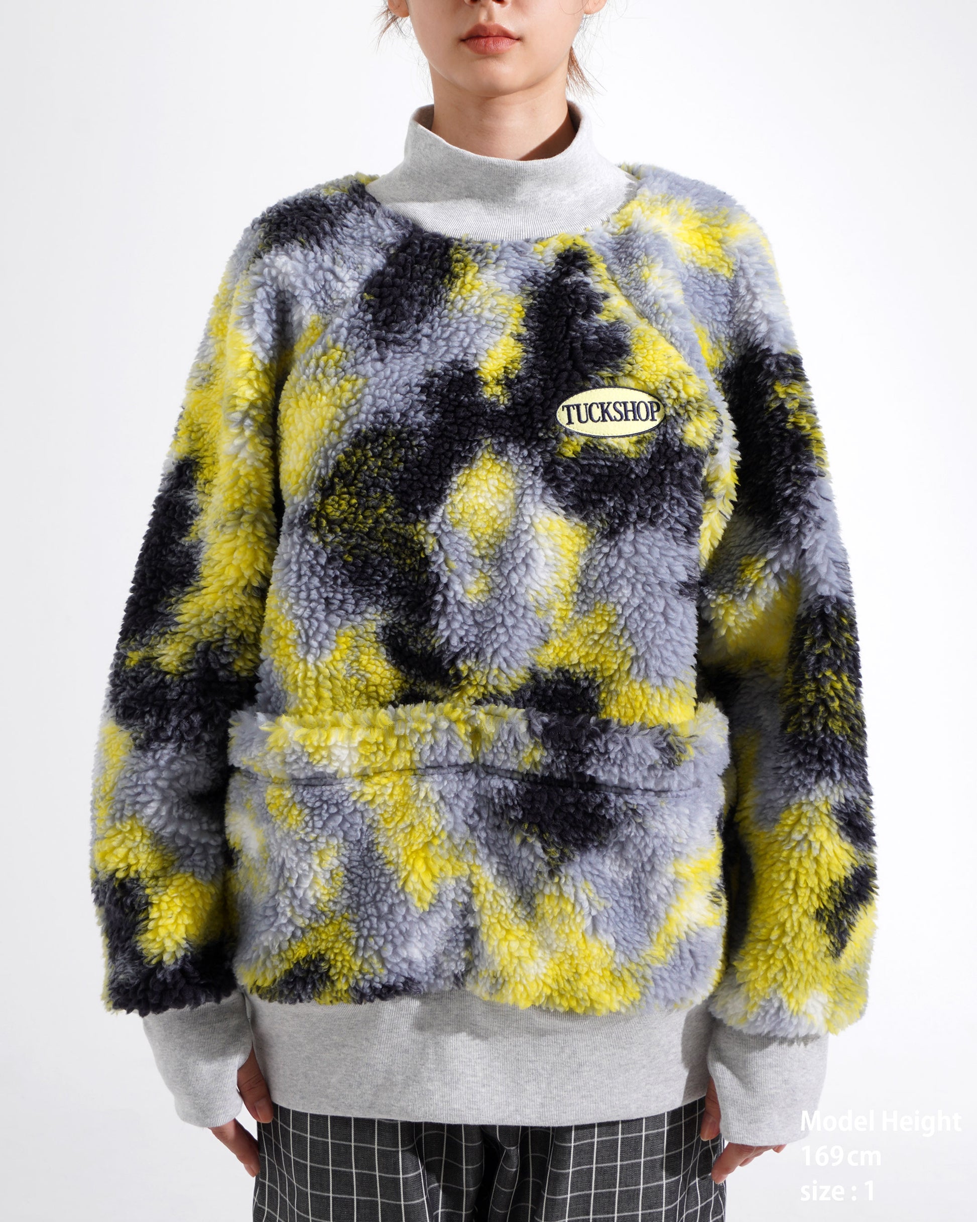 Recycled Polyester Sherpa Fleece Pullover - All-over camouflage graphic pattern - Ribbed cotton mock neck, hem, and cuffs - Raglan sleeves - Two front pockets - Seasonal logo patch on the front