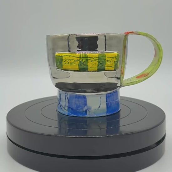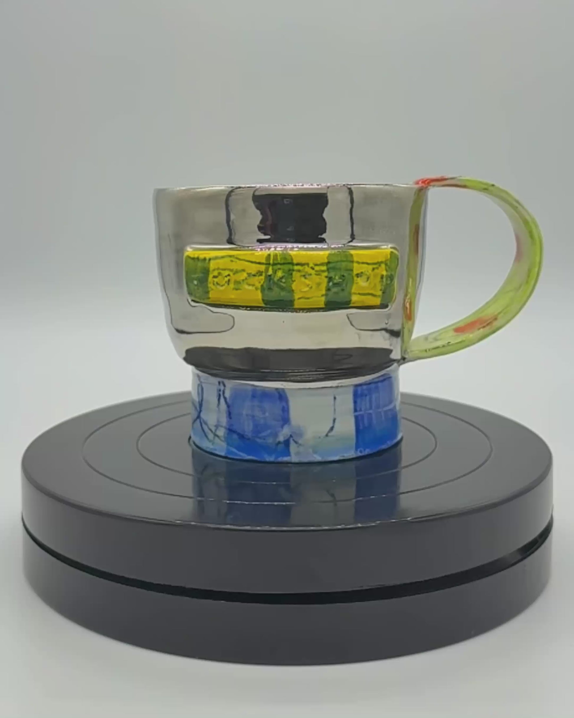 【P-15】 は、手触りのあるような絵柄で着色し、一部、プラチナでコーティングしております。作家の性質上、1点ものになります。側面と持ち手にロゴのエンボス刻印あり。