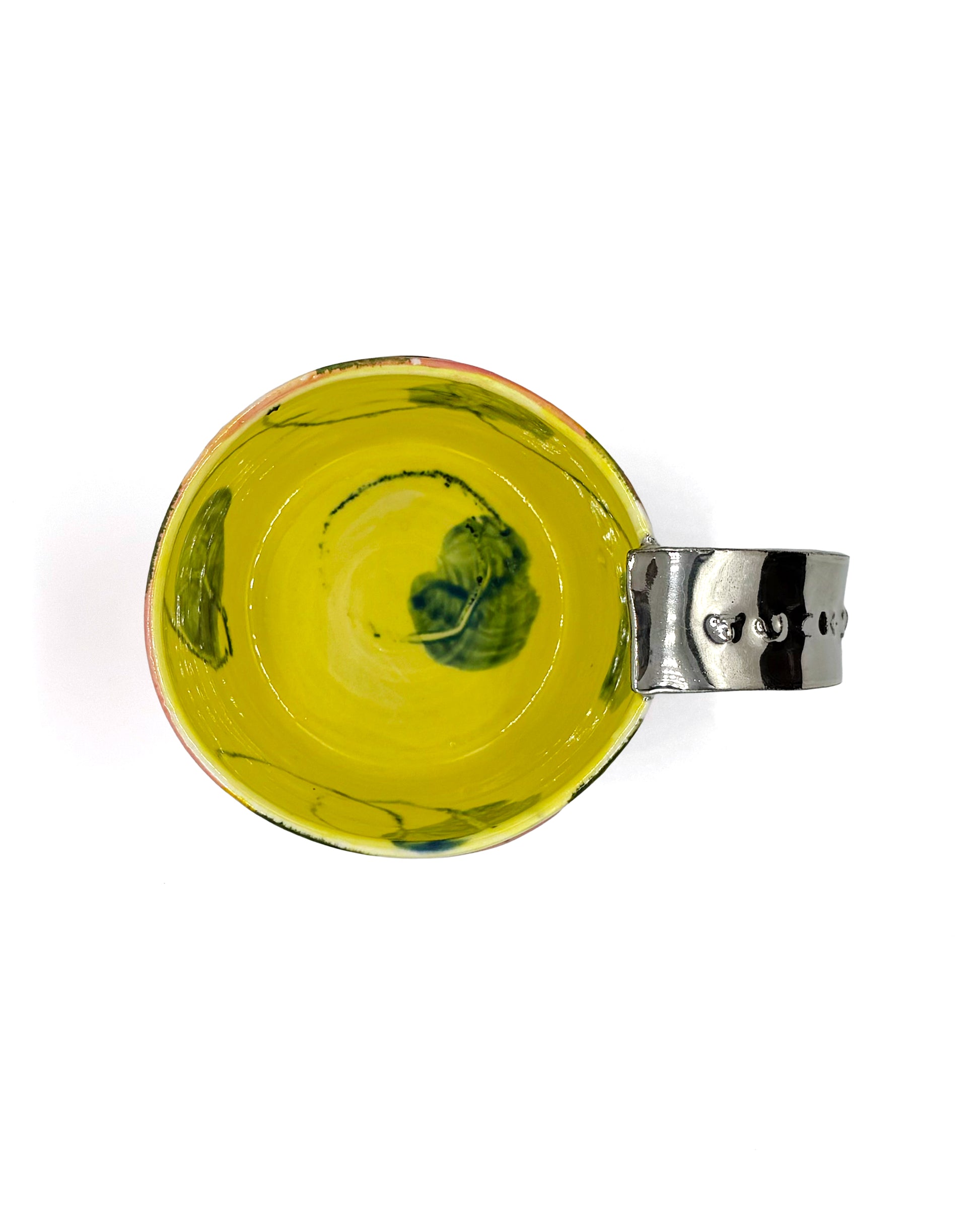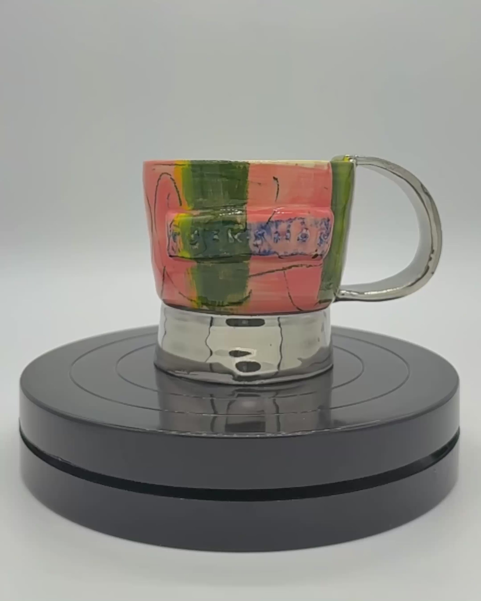 【P-16】 は、手触りのあるような絵柄で着色し、一部、プラチナでコーティングしております。作家の性質上、1点ものになります。側面と持ち手にロゴのエンボス刻印あり。