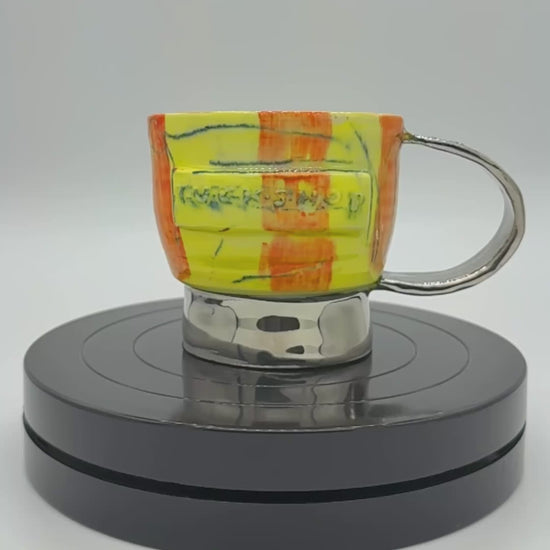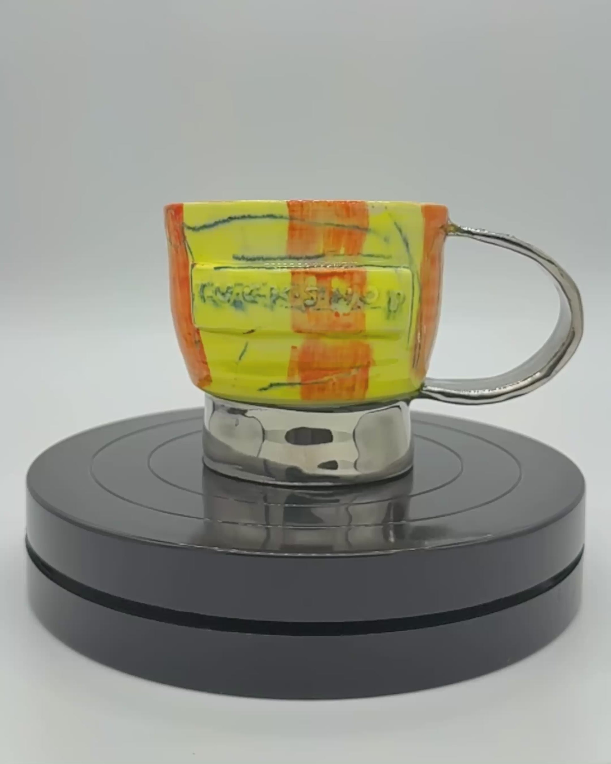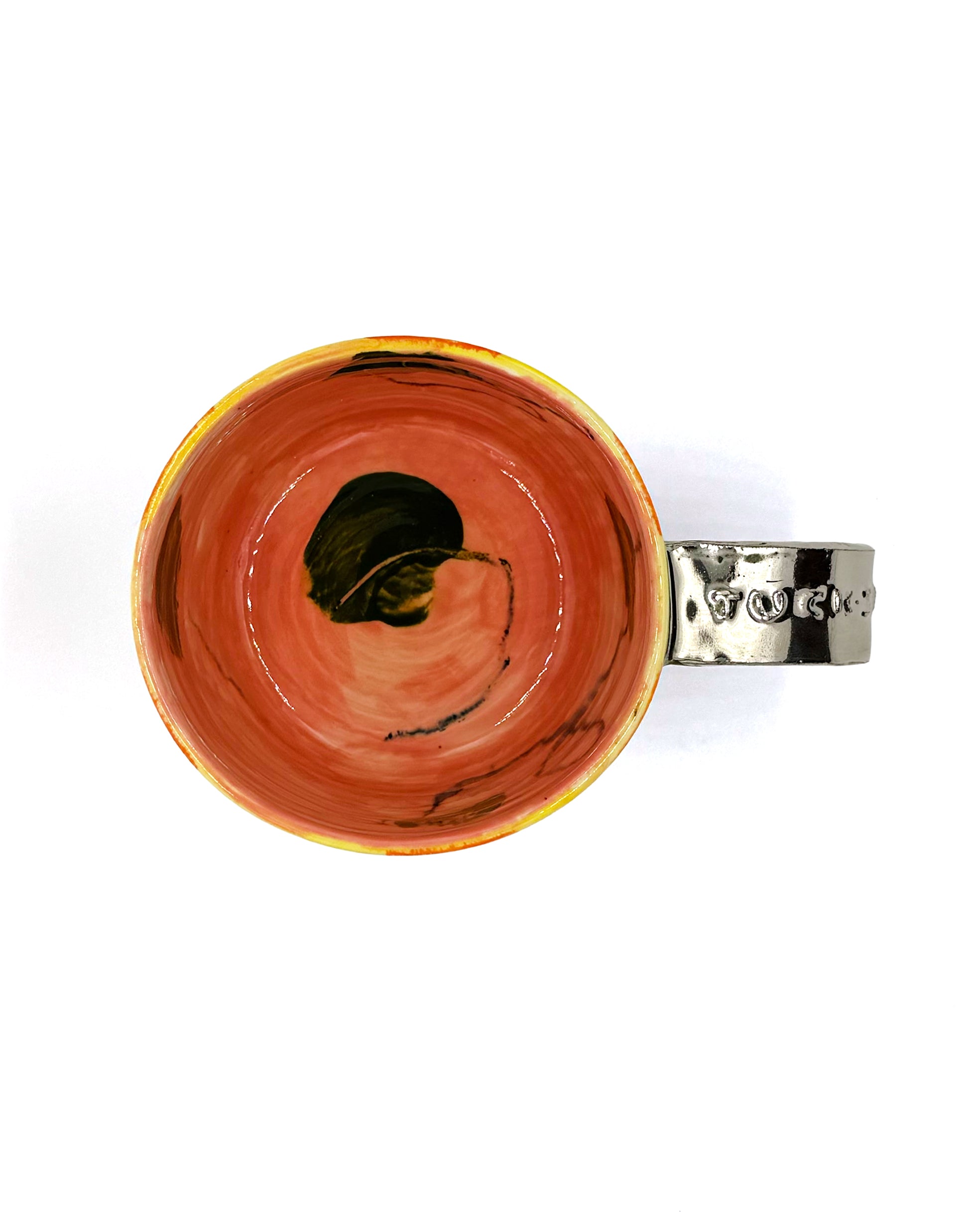 【P-17】 は、手触りのあるような絵柄で着色し、一部、プラチナでコーティングしております。作家の性質上、1点ものになります。側面と持ち手にロゴのエンボス刻印あり。