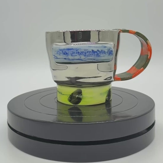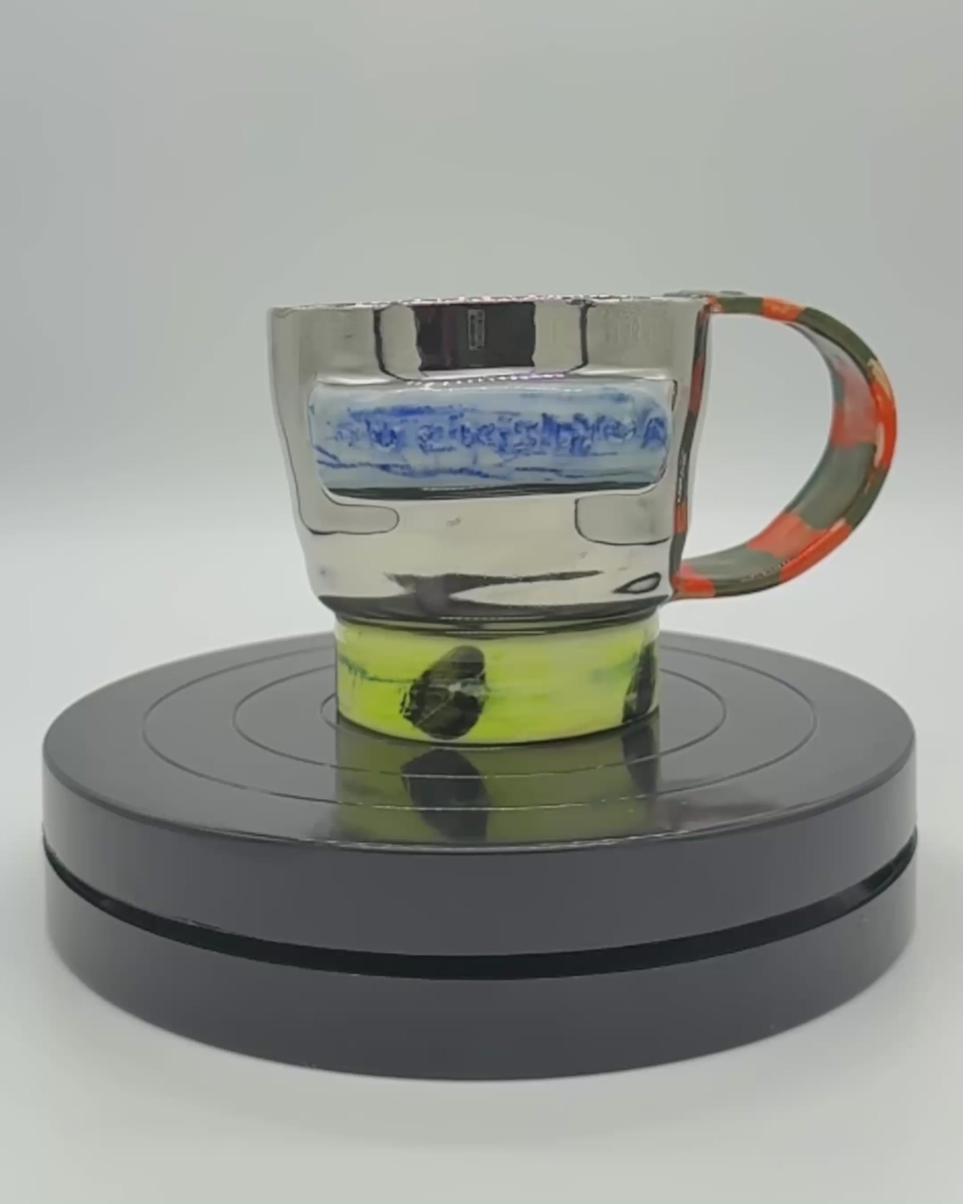 【P-19】 は、手触りのあるような絵柄で着色し、一部、プラチナでコーティングしております。作家の性質上、1点ものになります。側面と持ち手にロゴのエンボス刻印あり。